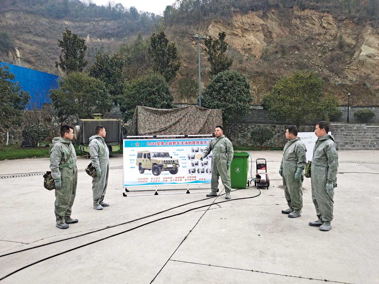 陜西省軍區(qū)組織民兵防化救援分隊(duì)進(jìn)行裝備洗消課目教學(xué)。(攝影/李增杰)