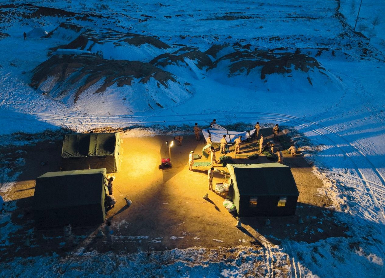 內(nèi)蒙古軍區(qū)在夜間嚴寒條件下組織民兵分隊開展野外指揮所開設訓練。(攝影/王 鑫)