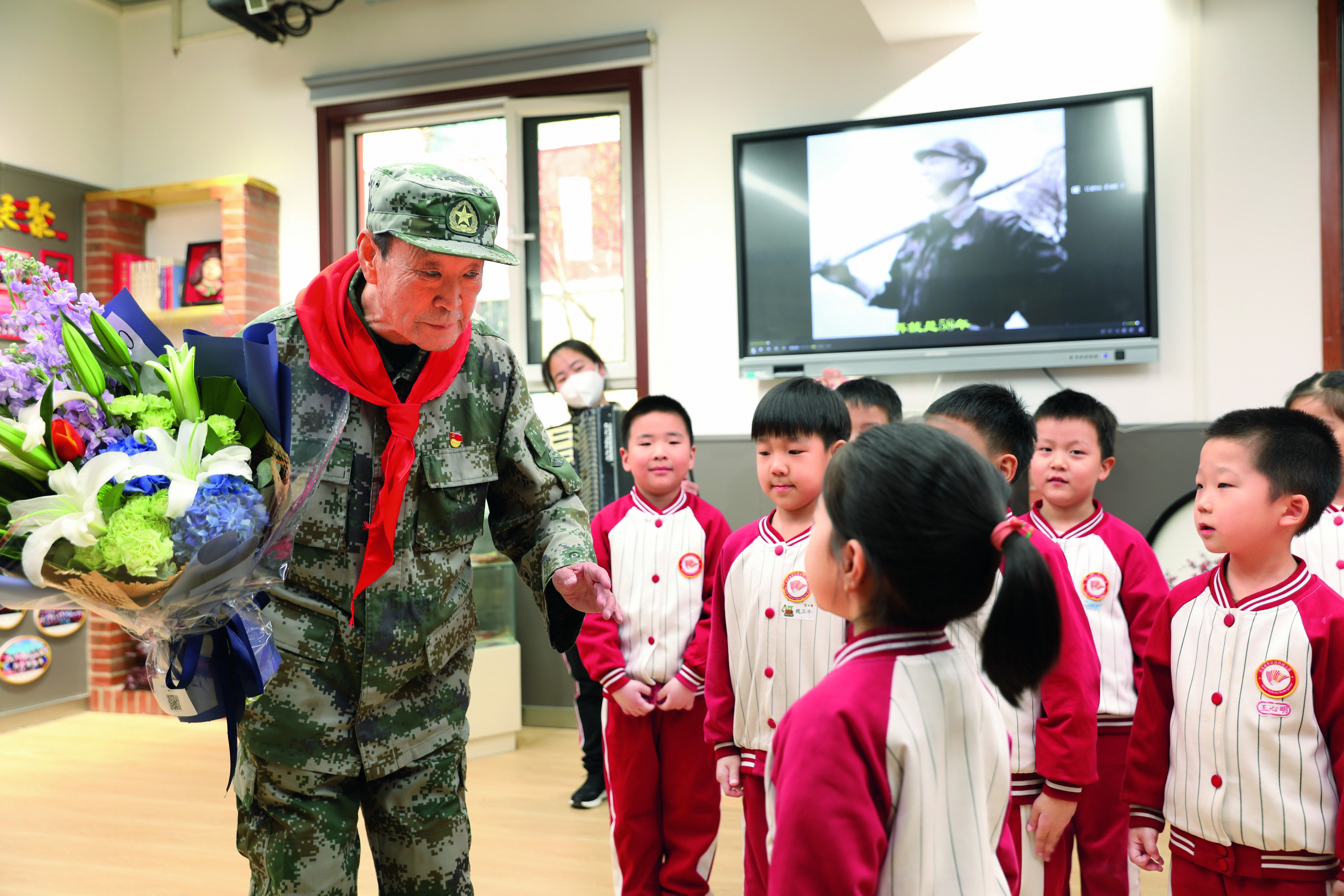 張連印生前與河北省軍區(qū)國防幼兒園的小朋友一起過“雷鋒日”。(攝影/侯玉春)
