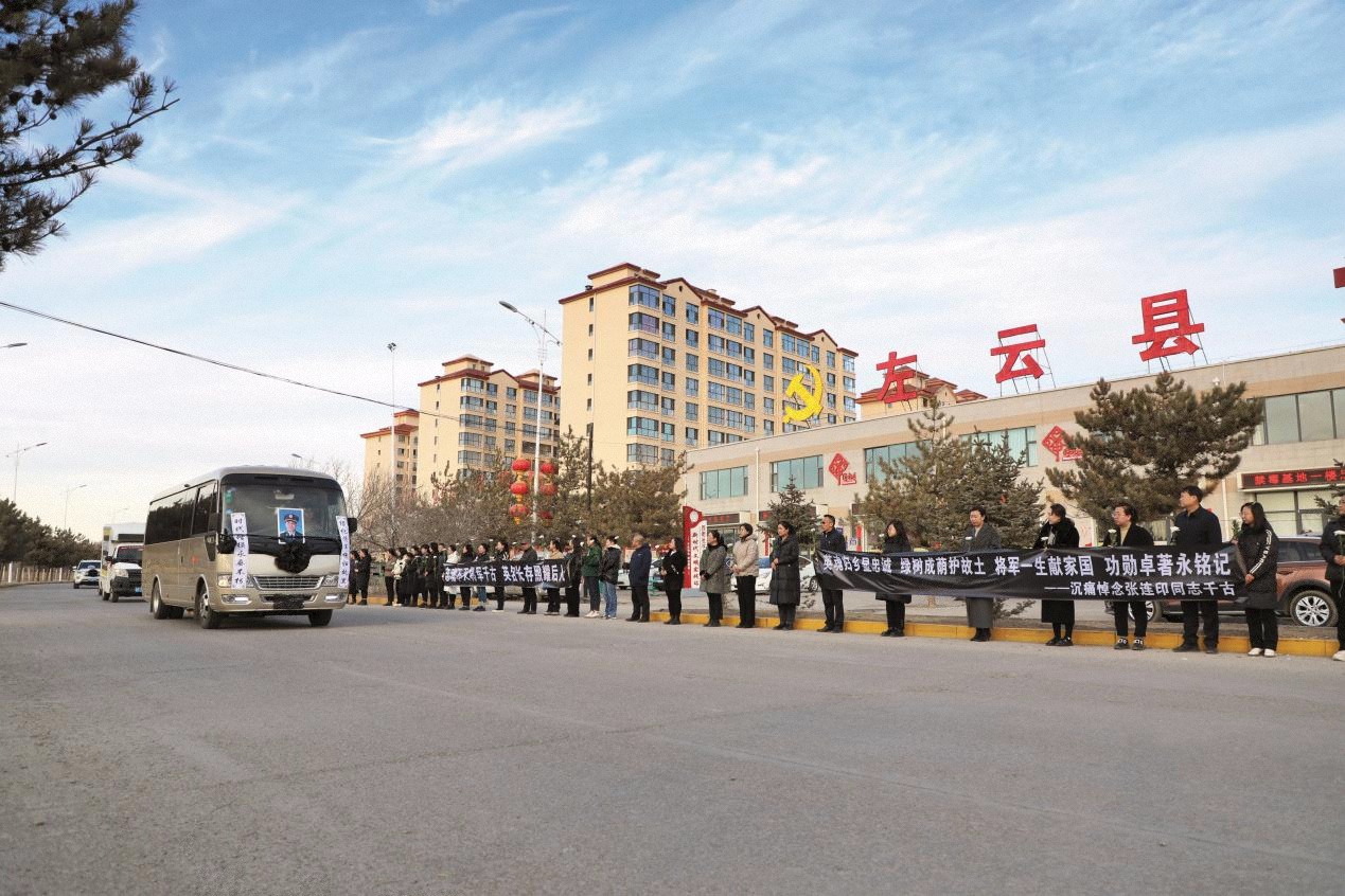 寒風(fēng)中,有的人手捧鮮花,有的人胸前佩戴著白花,還有的人拉著挽聯(lián)……在每一個十字路口,所有人都停下車等在那里,鞠躬敬禮。所有的車輛都自覺停在了一側(cè),讓護(hù)送張連印骨灰的車通過。這次,張連印再也不離開了。