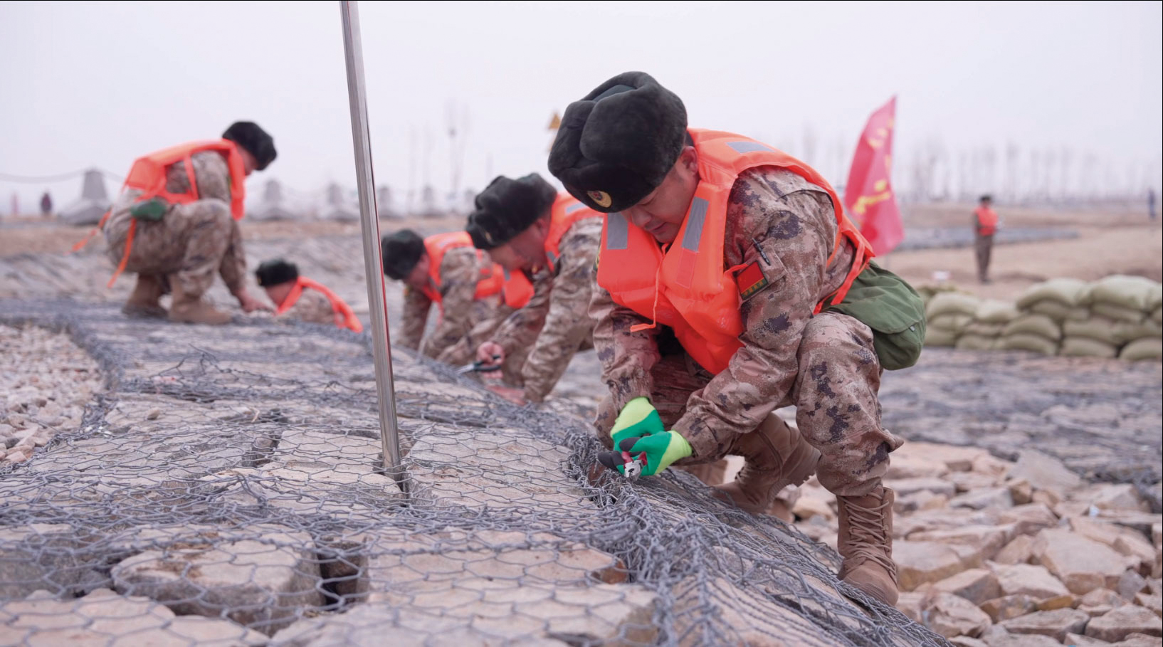 臨河區(qū)人武部組織民兵在黃河沿岸筑堤護(hù)壩。(攝影/張明禮)