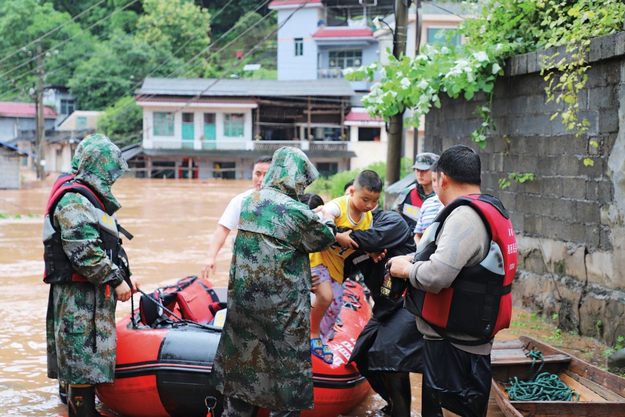 專武干部和民兵在湖南省吉首市河溪鎮(zhèn)轉移被洪水圍困群眾。