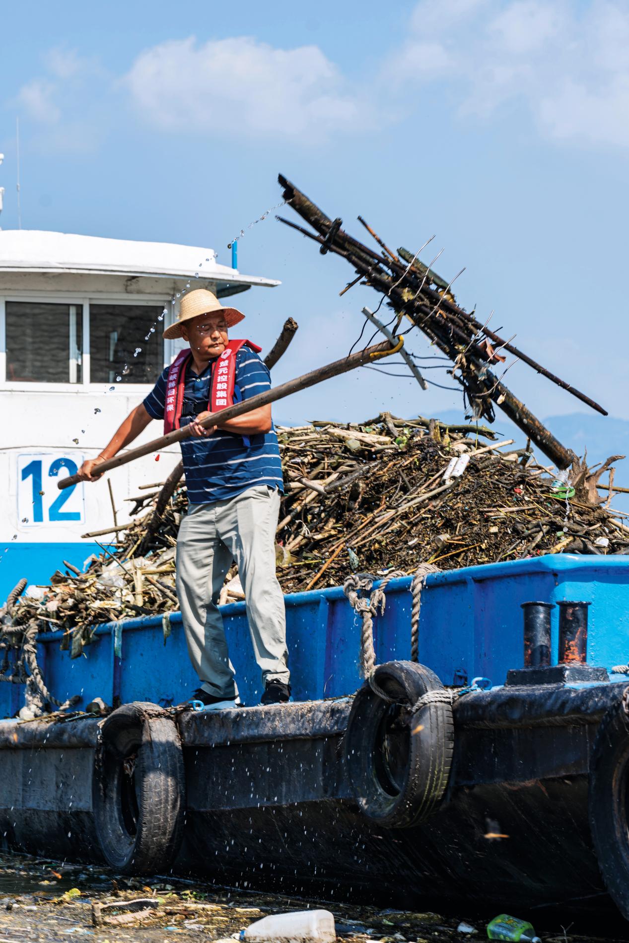“減速!停船!”隨著一個(gè)個(gè)口令的下達(dá),一艘近20米長(zhǎng)的清漂船已經(jīng)穩(wěn)穩(wěn)??吭谄∥锒逊e的點(diǎn)位,清漂船兩側(cè)甲板很窄,只見周功虎和隊(duì)員們小心翼翼站穩(wěn)腳跟,抄起頂端由粗鐵絲制成的大耙子,向水面一伸一舀再用力往船艙里一翻,便將樹枝、樹葉等一大團(tuán)漂浮物“收入囊中”。每一耙子撈起來(lái)的東西有三四十斤重,而類似的清漂動(dòng)作,周功虎每次出船總要重復(fù)上千次。風(fēng)里來(lái)、浪里去,晴天一身汗、雨天濕一身,周功虎帶領(lǐng)著清漂隊(duì)拿著微薄的補(bǔ)貼一干就是18年。