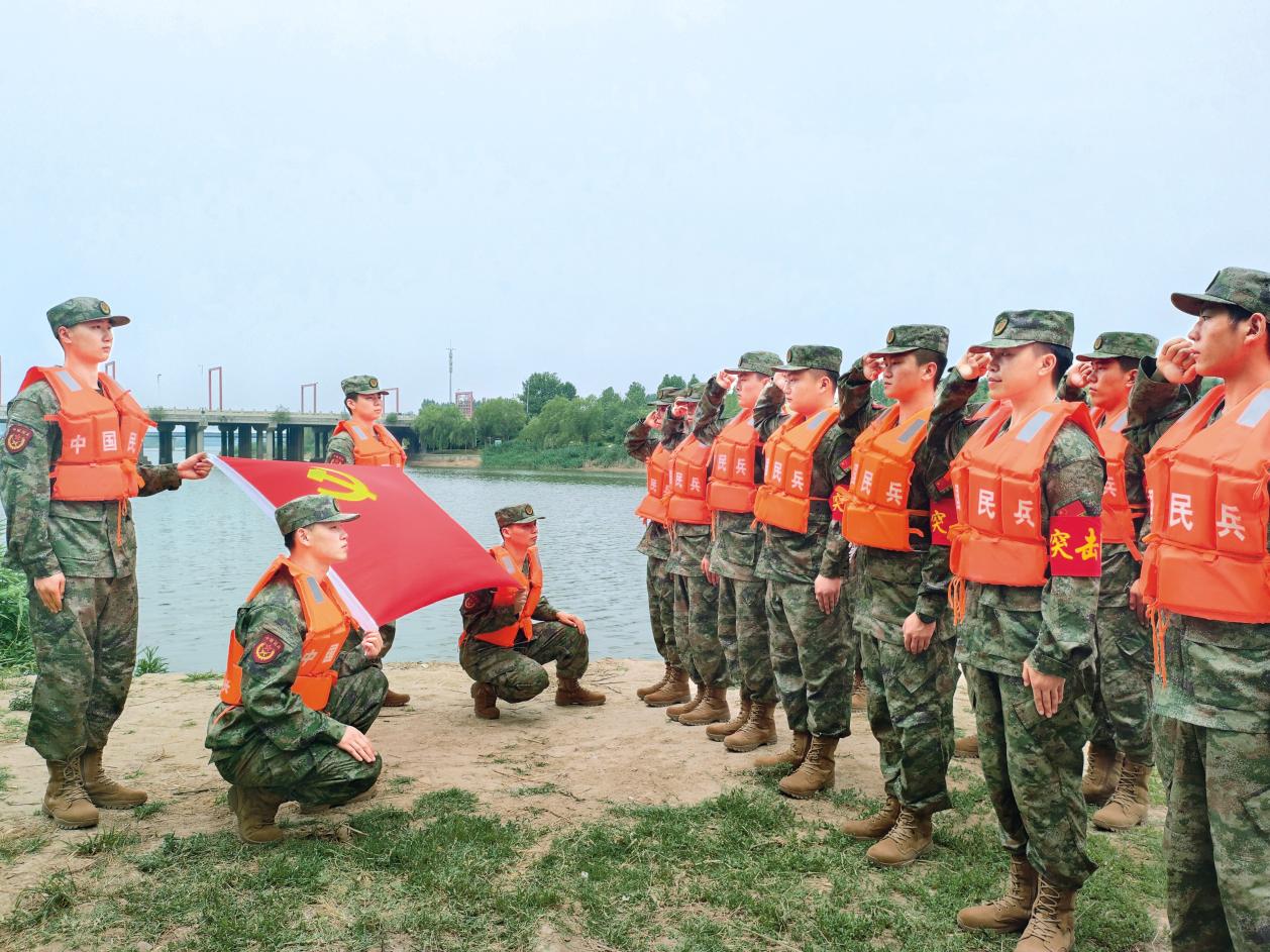 德州市民兵黨員突擊隊(duì)在遂行任務(wù)前面對(duì)黨旗莊嚴(yán)宣誓。(攝影/解建森)