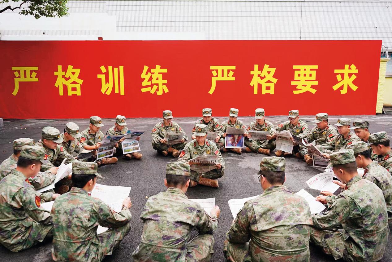 貴州省岑鞏縣人武部組織參訓民兵在訓練間隙學習報刊文章。(攝影/舒國響)