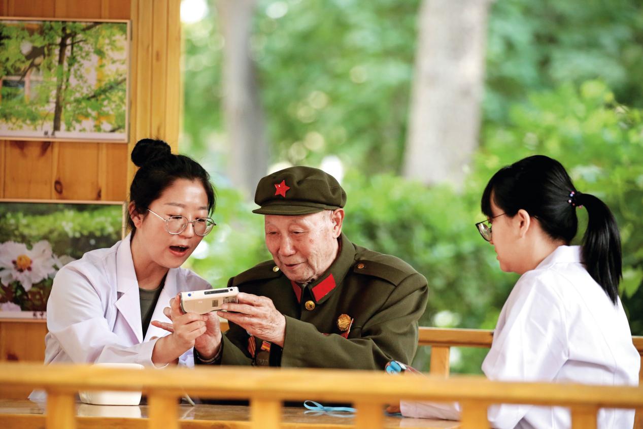 干休所醫(yī)護(hù)人員用移動(dòng)巡診系統(tǒng)為老干部檢查身體。