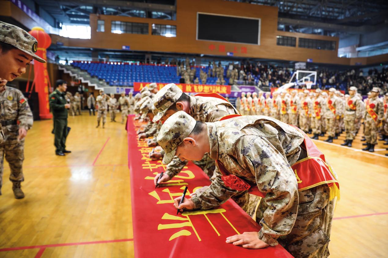 上饒市組織即將踏入軍營的新兵在橫幅上簽名。