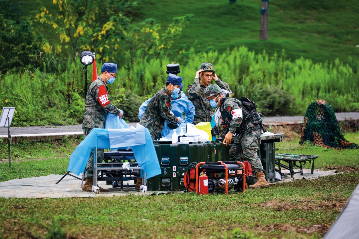 南京市鼓樓區(qū)民兵醫(yī)療救護分隊進行野外救護訓練。(攝影/曹竹嵚)