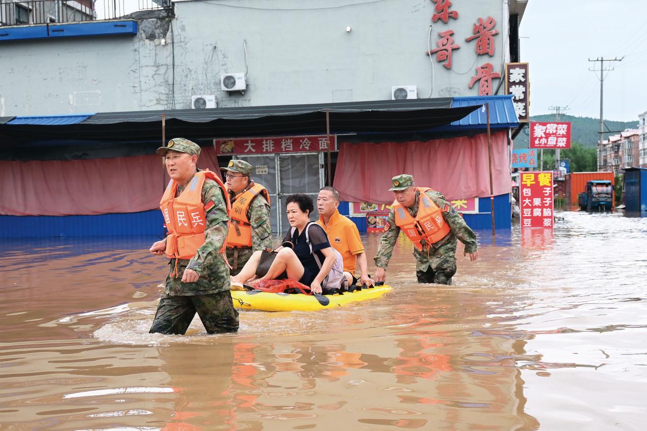 牡丹江市西安區(qū)人武部組織民兵“黨員突擊隊”轉(zhuǎn)移受困群眾。(攝影/張春祥)
