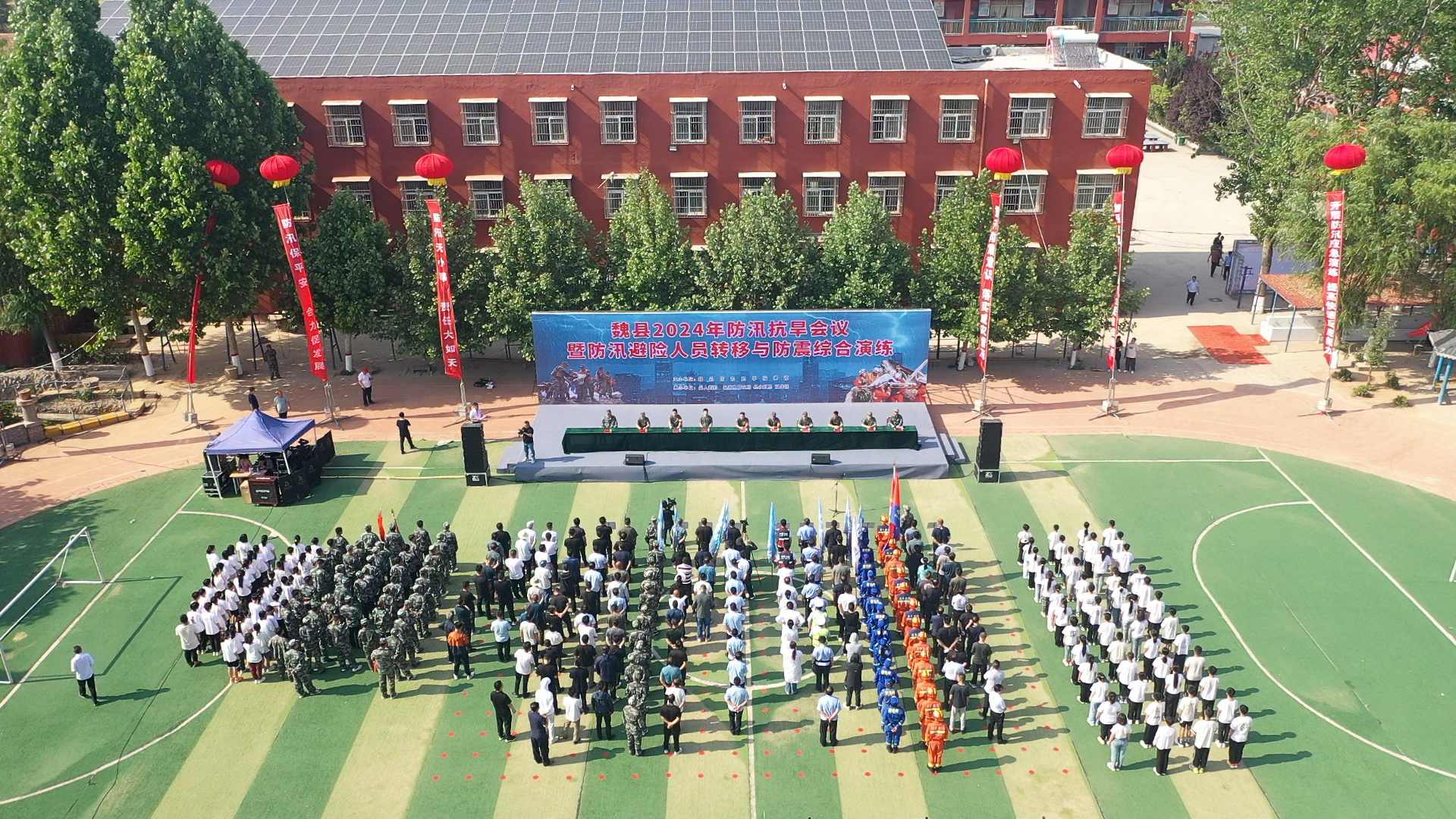 魏縣組織2024年防汛抗旱會議暨防汛避險人員轉(zhuǎn)移與防震綜合演練。(攝影/翟 峰)