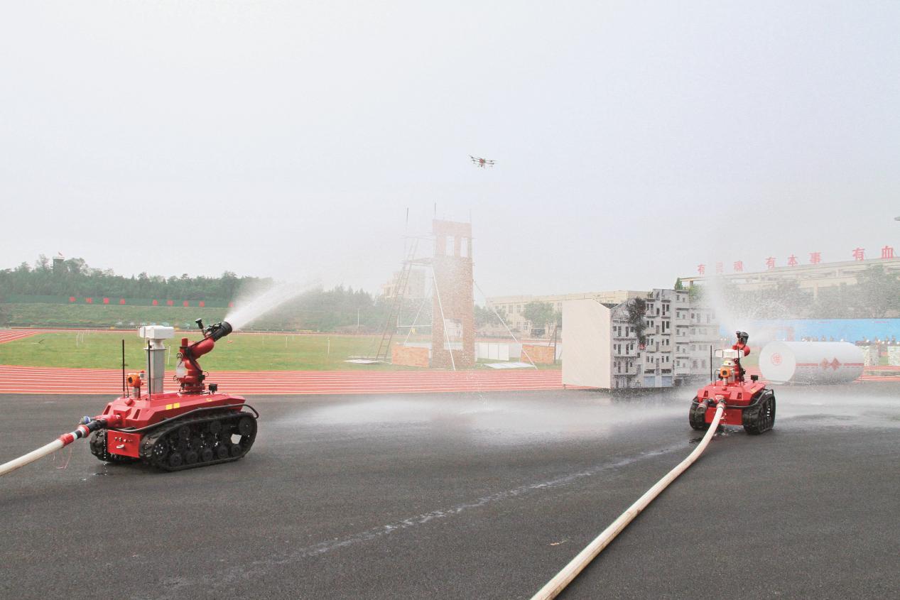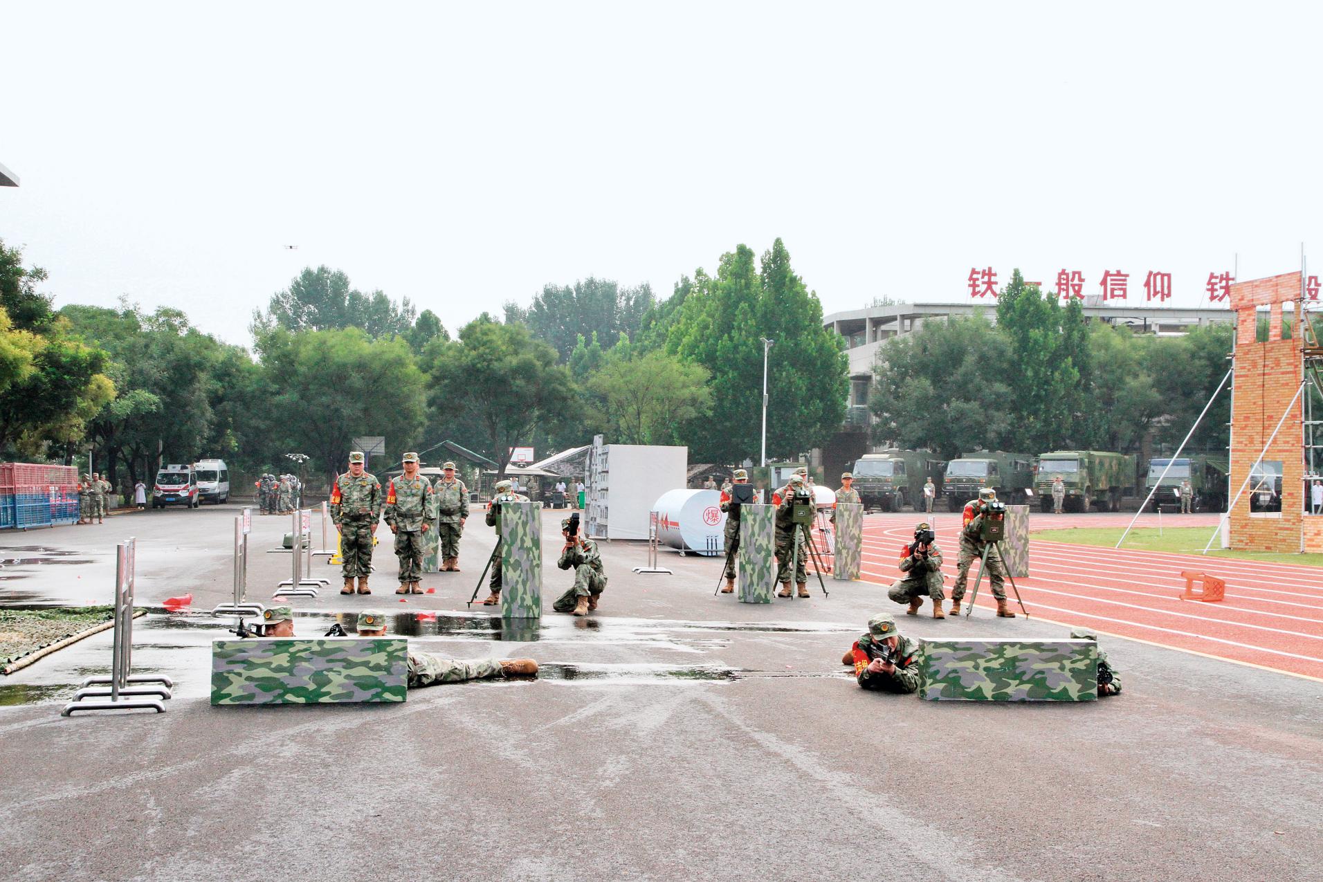 邯鄲軍分區(qū)組織民兵防化分隊操控洗消機器人對“污染廠區(qū)”進行洗消訓(xùn)練。(攝影/康盼盼)