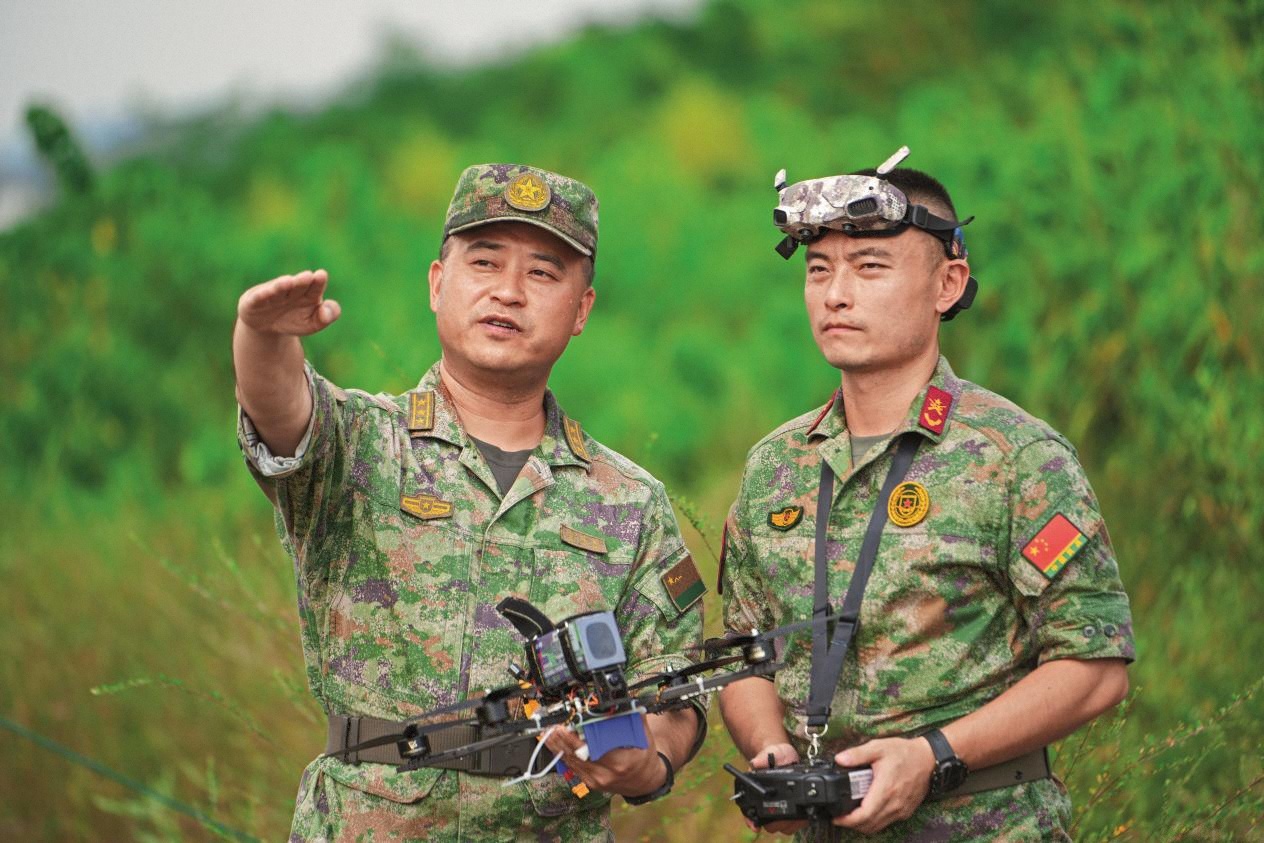 章閱兵正在與民兵骨干研究無人機飛行路線。
