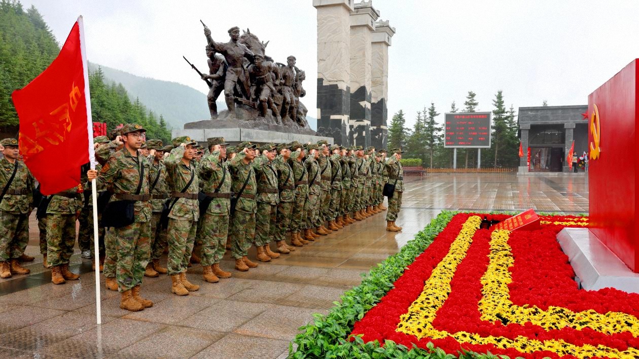 寧夏中衛(wèi)軍分區(qū)組織專武干部在紅色場館前開展重溫入黨誓詞活動。