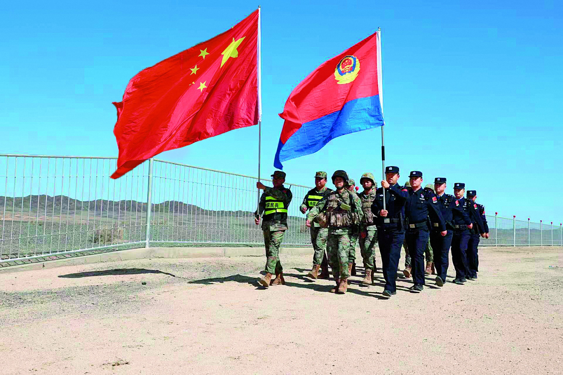 描紅結(jié)束后,蔡龍?zhí)统鲂彀l(fā)放給大家并動情地說道:“雖然我們不能去天安門廣場看升旗,但我們要讓國旗在邊境線上飄揚。”鮮紅的國旗與國門、界碑交相輝映,那抹中國紅在戈壁灘上格外耀眼。