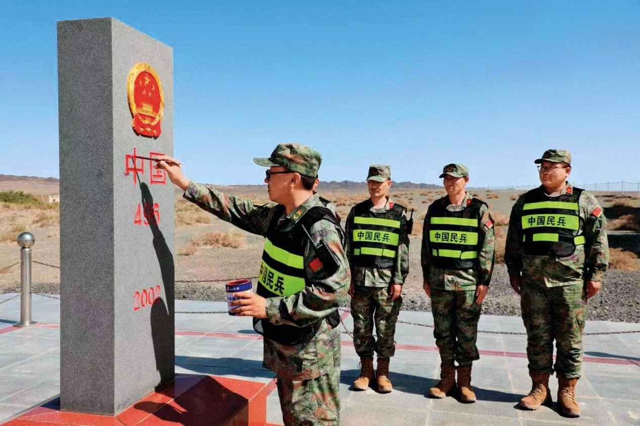 馬鬃山鎮(zhèn)邊防民兵哨所民兵正在為界碑描紅。