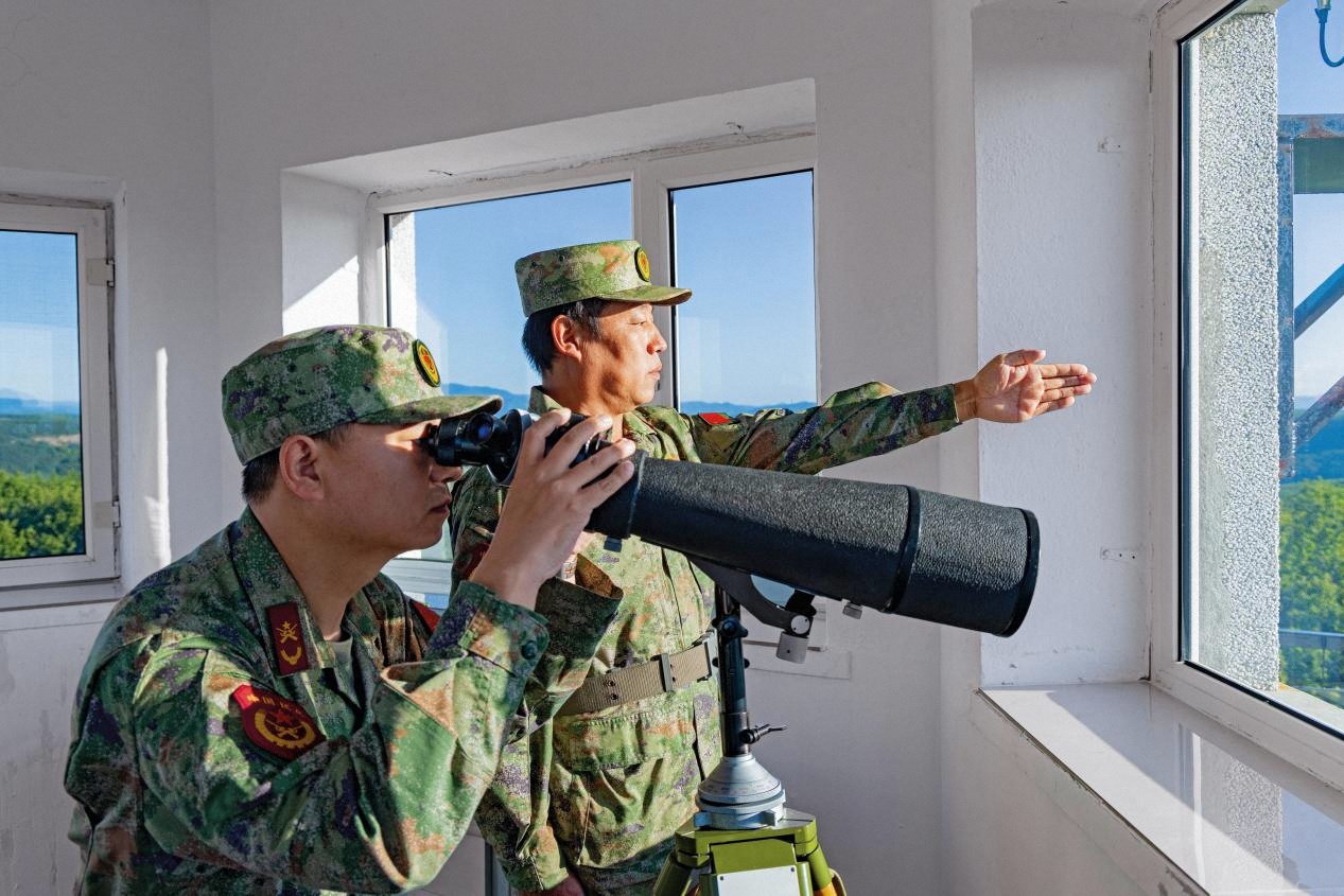 東寧市民兵哨所民兵利用望遠鏡觀察邊界一線情況。