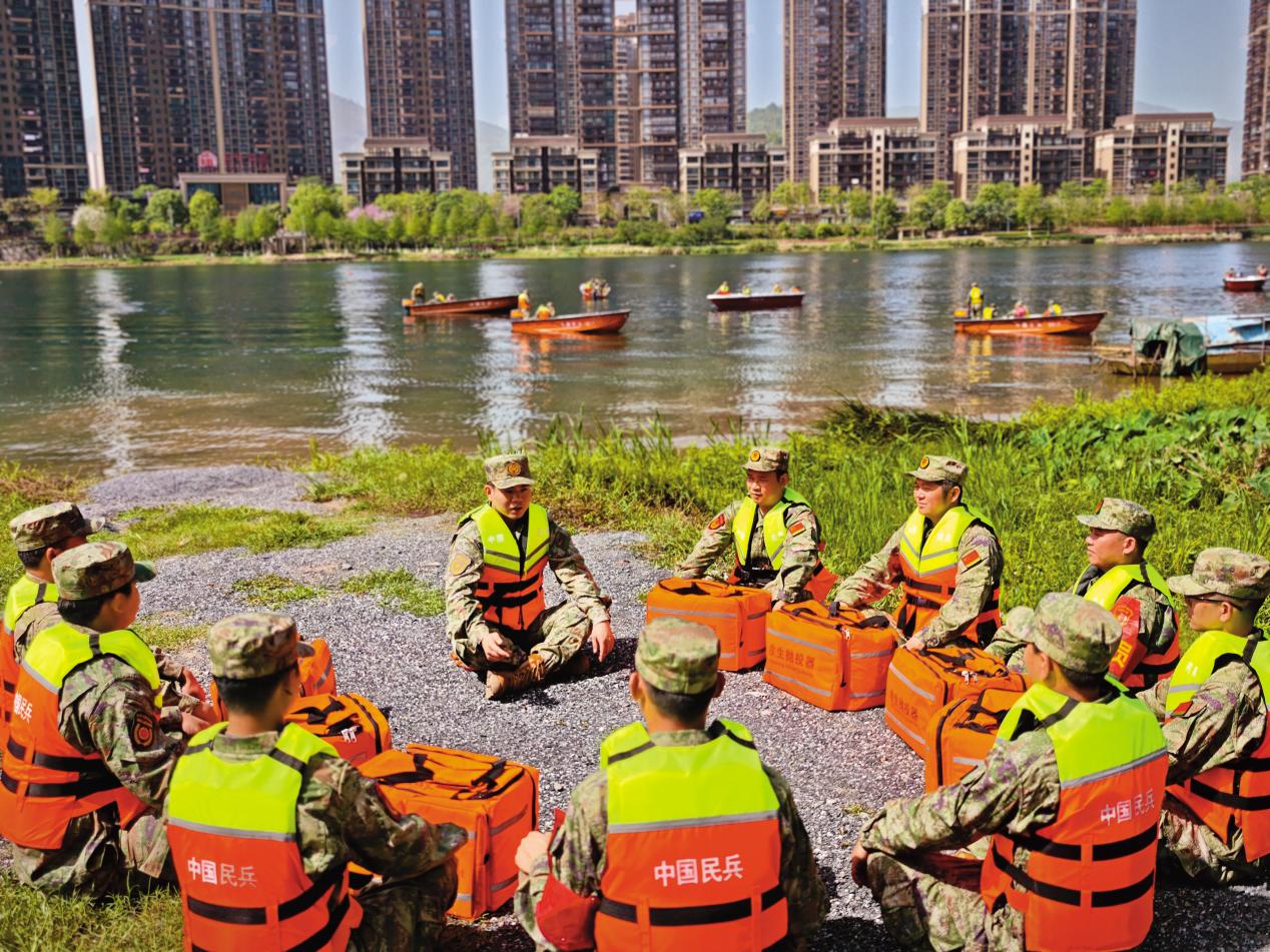 陽山縣人武部文職人員在訓(xùn)練間隙與民兵骨干進(jìn)行討論交流。(攝影/丁立敏)