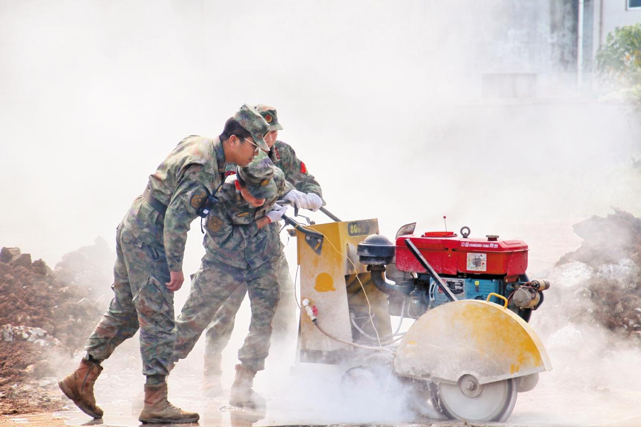 正定縣人武部組織民兵專業(yè)分隊(duì)與空軍某場(chǎng)站官兵進(jìn)行道路搶修搶建聯(lián)演聯(lián)訓(xùn)。(攝影/王雙豹)