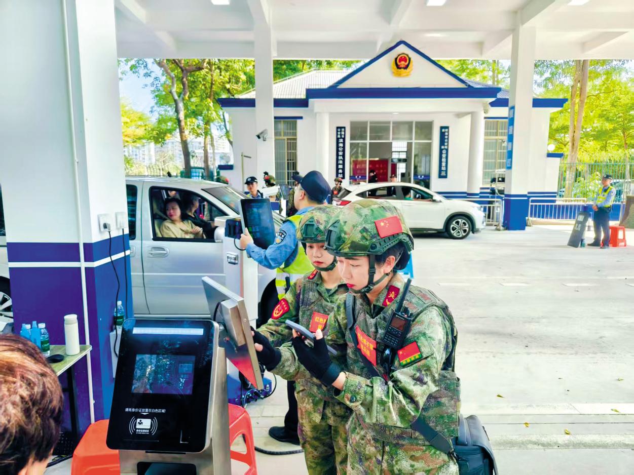 紅色娘子軍民兵連女民兵在博鰲亞洲論壇2025年年會(huì)舉行期間對(duì)過往車輛進(jìn)行安檢。