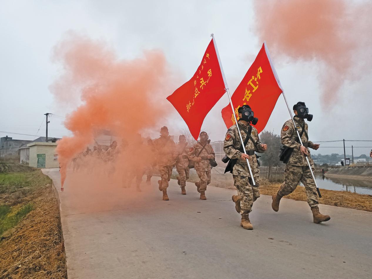 黃繼光民兵連在組織民兵徒步拉練途中快速穿過染毒地帶。