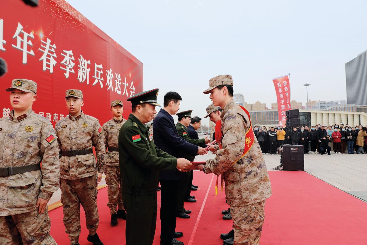 鶴壁市軍地領導為即將踏入軍營的入伍新兵頒發(fā)證書。