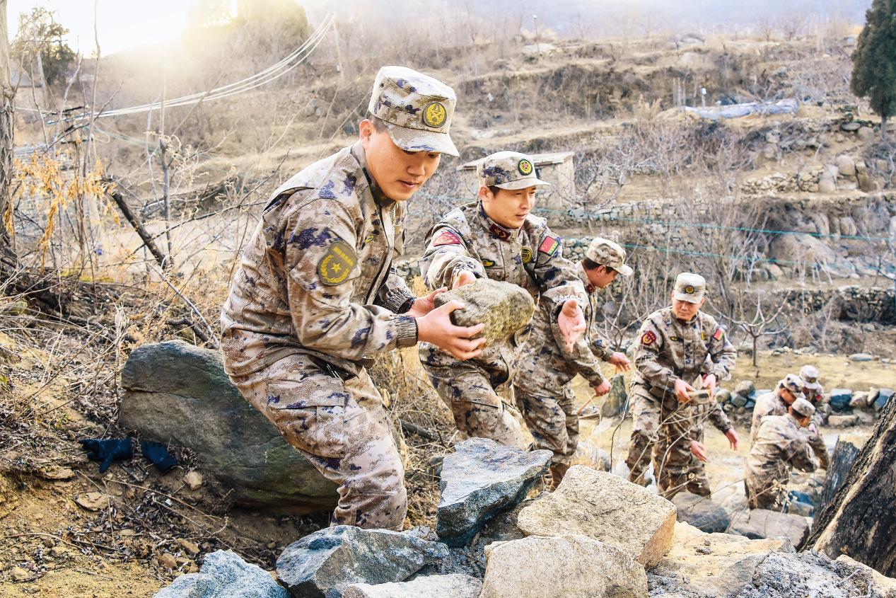 岱岳區(qū)人武部組織民兵幫助徂徠村對山體滑坡地段進行除險加固。