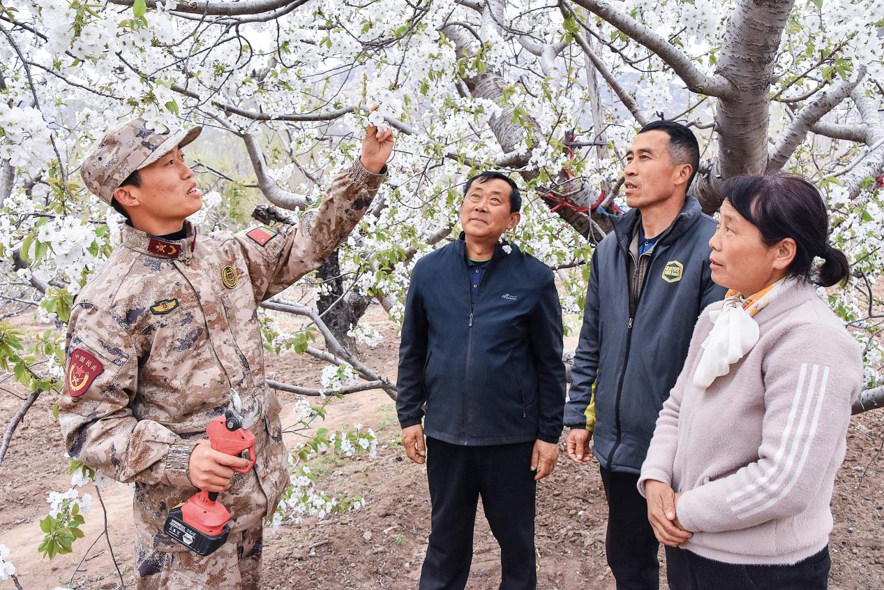 岱岳區(qū)人武部組織民兵技術員向村民傳授櫻桃樹種植技術。