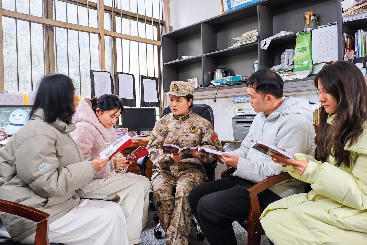 2024年年初,由修水縣軍地聯(lián)合編印的《高山紅哨》校本教材出版并在全縣各中小學(xué)校推廣,再次掀起“講‘紅哨’故事、學(xué)‘紅哨’傳統(tǒng)、贊‘紅哨’精神、做‘紅哨’傳人”的熱潮。這本教材的主編帥文慧就是黃龍山民兵排的民兵,也是一名土生土長的修水縣人。她從小聽著父輩們講述黃龍山民兵排的故事長大,那一個個堅(jiān)守大山作奉獻(xiàn)的爺爺和伯伯們的事跡深深烙進(jìn)了她的心里。2019年帥文慧大學(xué)畢業(yè)后放棄在城市工作的機(jī)會,毅然選擇回到家鄉(xiāng)當(dāng)上了一名鄉(xiāng)村教師,并經(jīng)過層層挑選最終如愿加入了黃龍山民兵排。