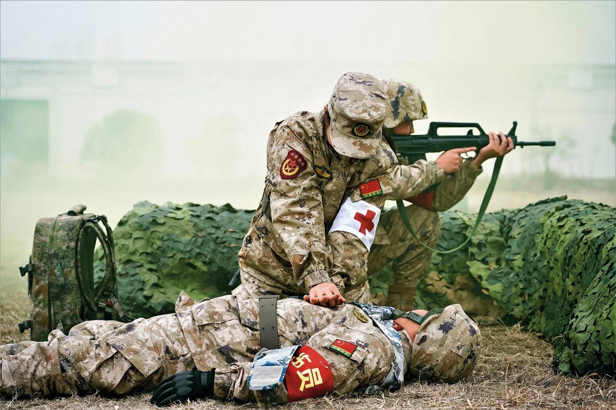 隨州軍分區(qū)組織民兵進(jìn)行戰(zhàn)場(chǎng)救護(hù)訓(xùn)練。(攝影/丁唯實(shí))