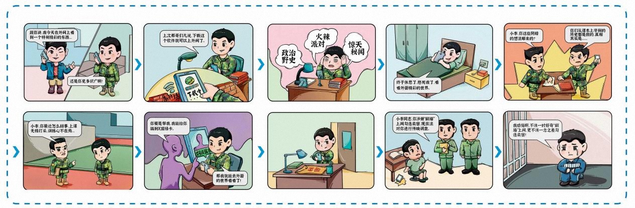 編者按:當今時代,網絡技術發(fā)展日新月異,信息技術革命浪潮迭起,這不僅深刻影響著官兵的思維方式和價值觀念,也催生出許多新情況新問題。網絡安全問題已成為我們面臨的最復雜、最現實、最嚴峻的安全問題之一。為配合打好糾治“翻墻”上網、網賭網貸、酒駕醉駕“三大頑疾”主動仗,本期“法治視窗”欄目以“網絡無邊、安全有界”為題推出一組警示教育漫畫,以期幫助大家認清“翻墻”上網的手段伎倆及現實危害,從而不斷強化網絡安全意識、筑牢網絡安全防線。