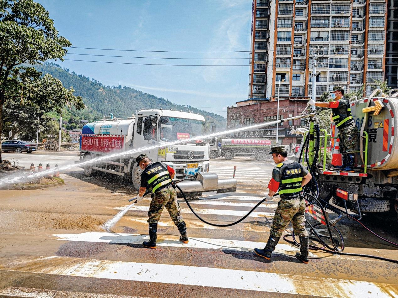 劍河縣人武部組織民兵分隊(duì)對城區(qū)主干道路進(jìn)行沖洗清理。(攝影/李志華)