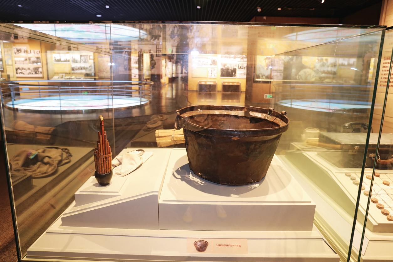 這口行軍鍋鍋沿卷邊、鍋底斑駁,鍋身布滿深淺不一的裂紋和17塊鐵補丁?!叭f里長征路上,這口行軍鍋跟著紅軍戰(zhàn)士上過雪山、走過草地,一直用到抗日戰(zhàn)爭時期。壞了補,補了又壞,說它為革命‘鞠躬盡瘁’一點也不為過?!毙熊婂伵?,講解員講述著它的故事。