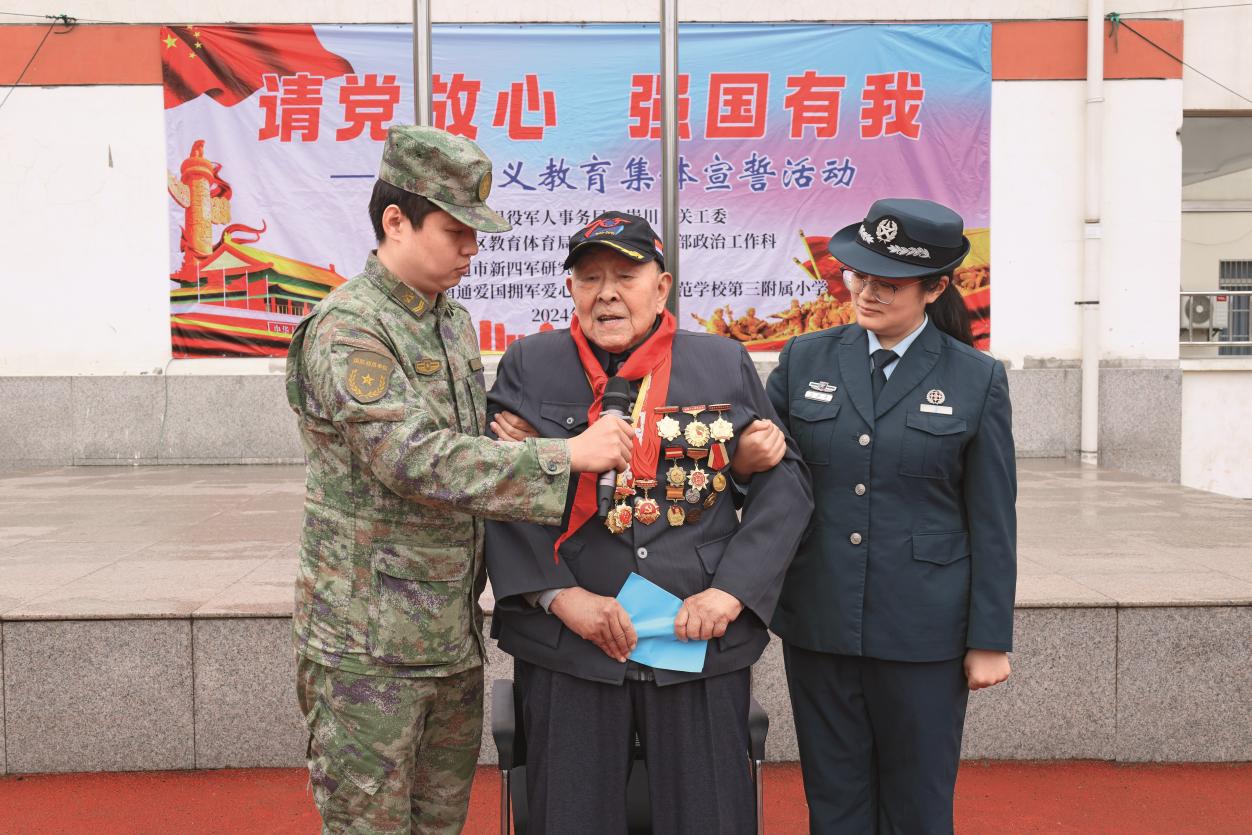 劉錫昌(居中)受邀參加南通市崇川區(qū)人武部主題教育活動(dòng)并分享自己曾經(jīng)的參戰(zhàn)經(jīng)歷。(攝影/袁文燕)
