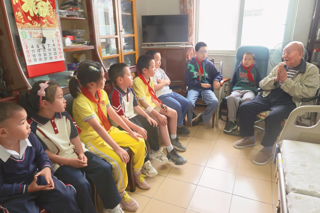 劉錫昌(右一)為江蘇省軍區(qū)南通離職干部休養(yǎng)所部分工作人員子女講述抗戰(zhàn)故事。(攝影/周萬順)