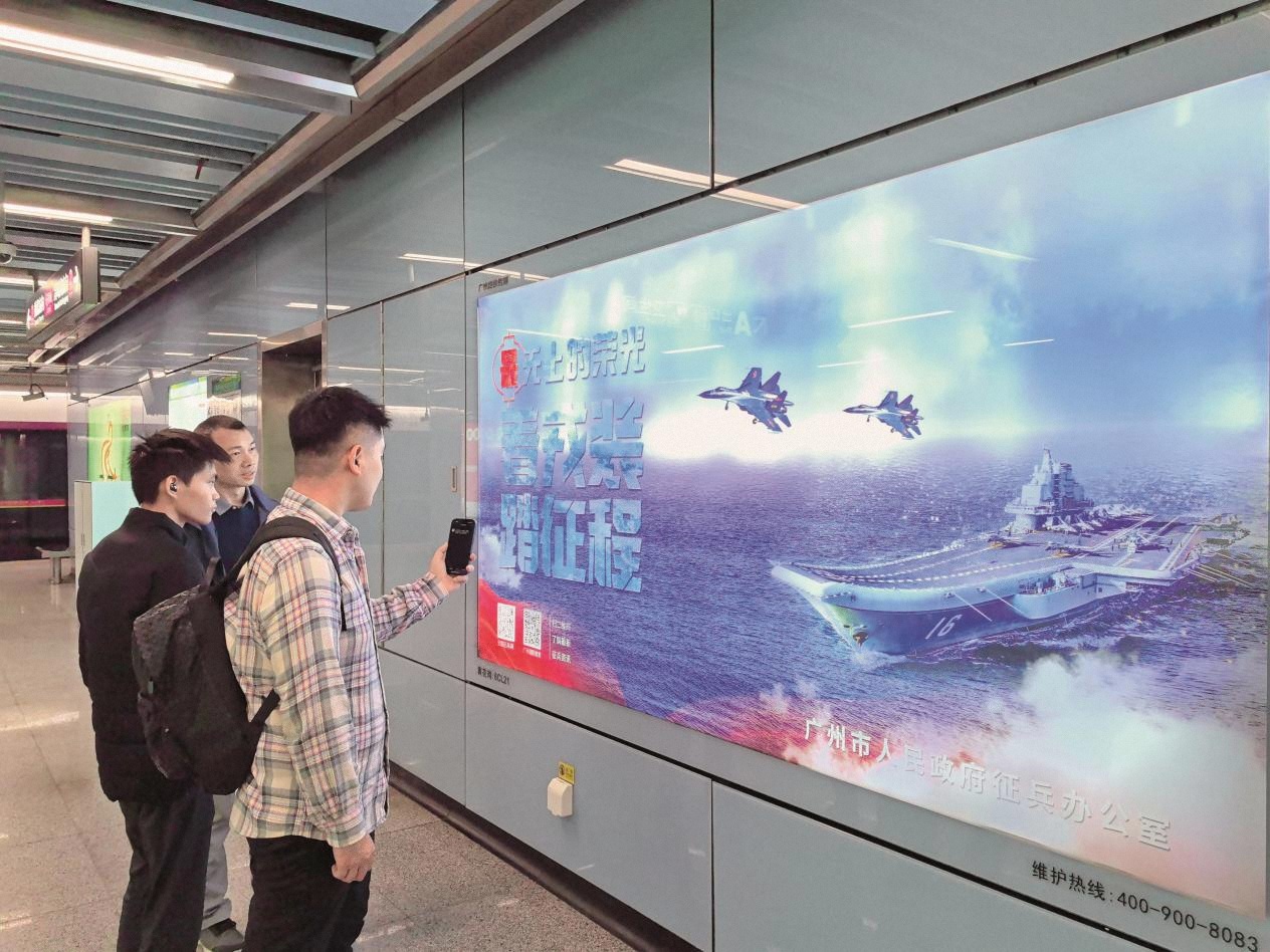 廣州市在地鐵入口等人員流動頻繁場所設(shè)置燈箱、櫥窗進行常態(tài)征兵宣傳。(攝影/張銀峰)