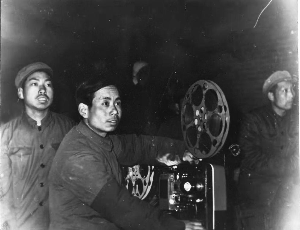 1980年,民兵盧梅芳(左二)正在為冬訓民兵播放電影。(攝影/閆新華)
