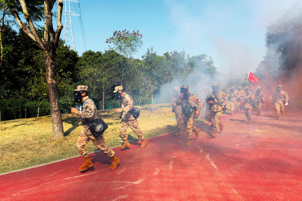 深圳市寶安區(qū)人武部組織民兵應(yīng)急分隊(duì)展開(kāi)快速通過(guò)染毒地帶課目訓(xùn)練。