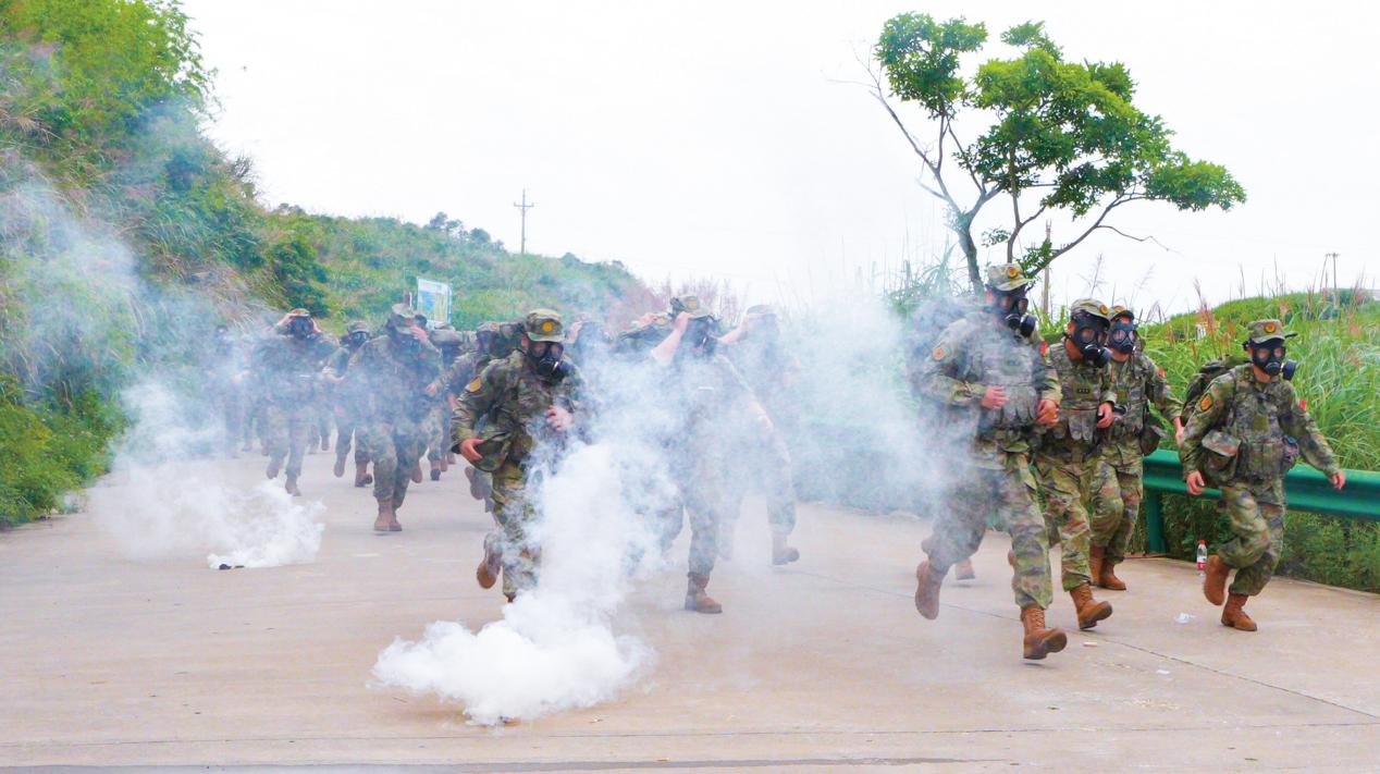 溫嶺市人武部組織民兵應(yīng)急分隊(duì)展開快速通過染毒地帶課目演練。(攝影/邵林曄)