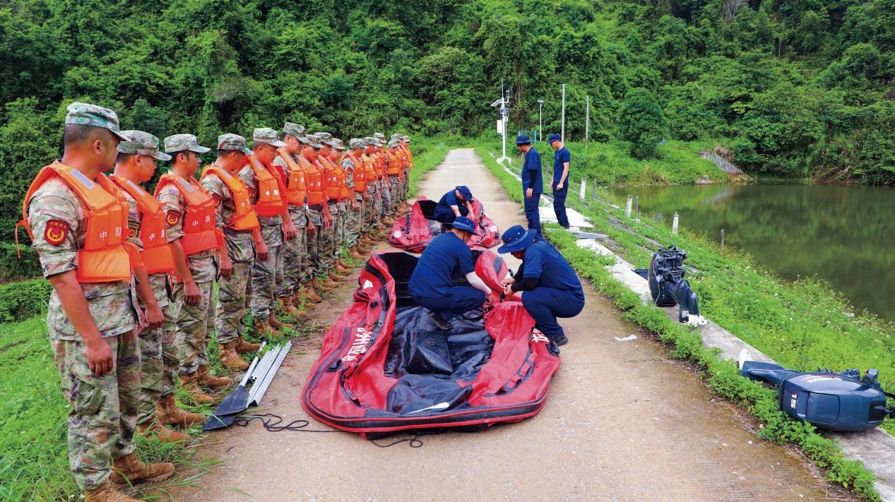 龍州縣人武部邀請(qǐng)地方專業(yè)技術(shù)人員為民兵應(yīng)急分隊(duì)進(jìn)行沖鋒舟操作示范教學(xué)。(攝影/黃玉超)