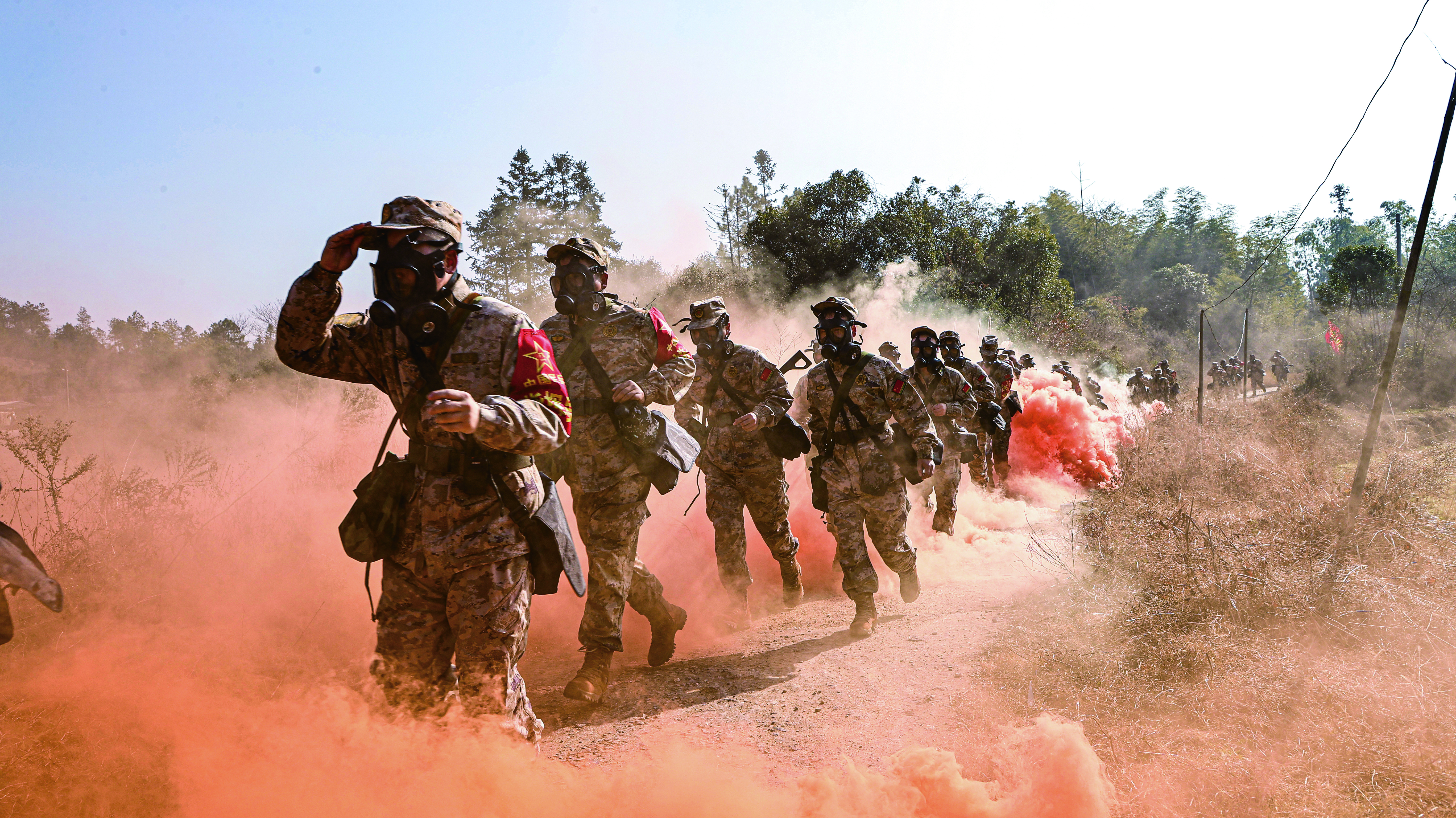 吉安軍分區(qū)組織民兵應(yīng)急分隊(duì)在拉練途中快速通過(guò)染毒地帶。