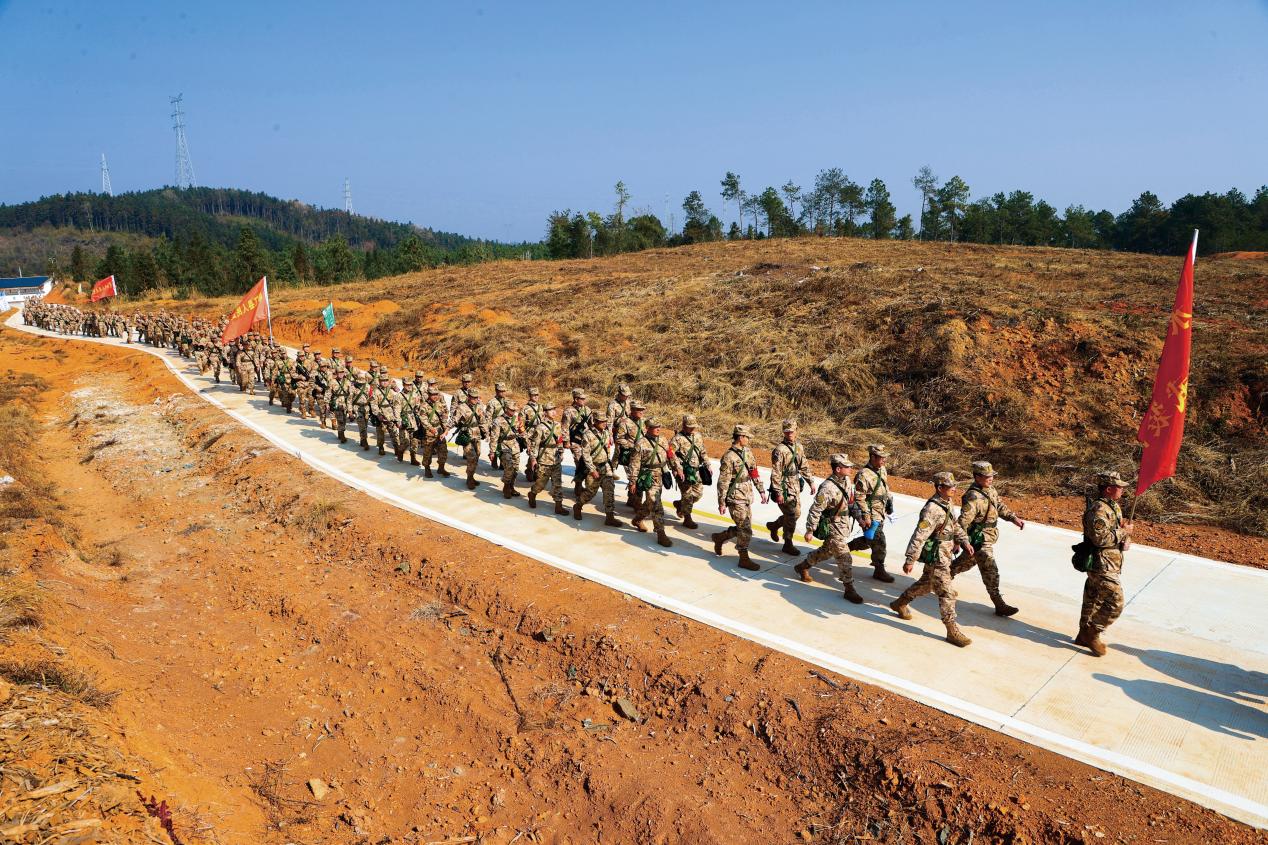 吉安軍分區(qū)組織民兵分隊(duì)進(jìn)行野外徒步拉練。