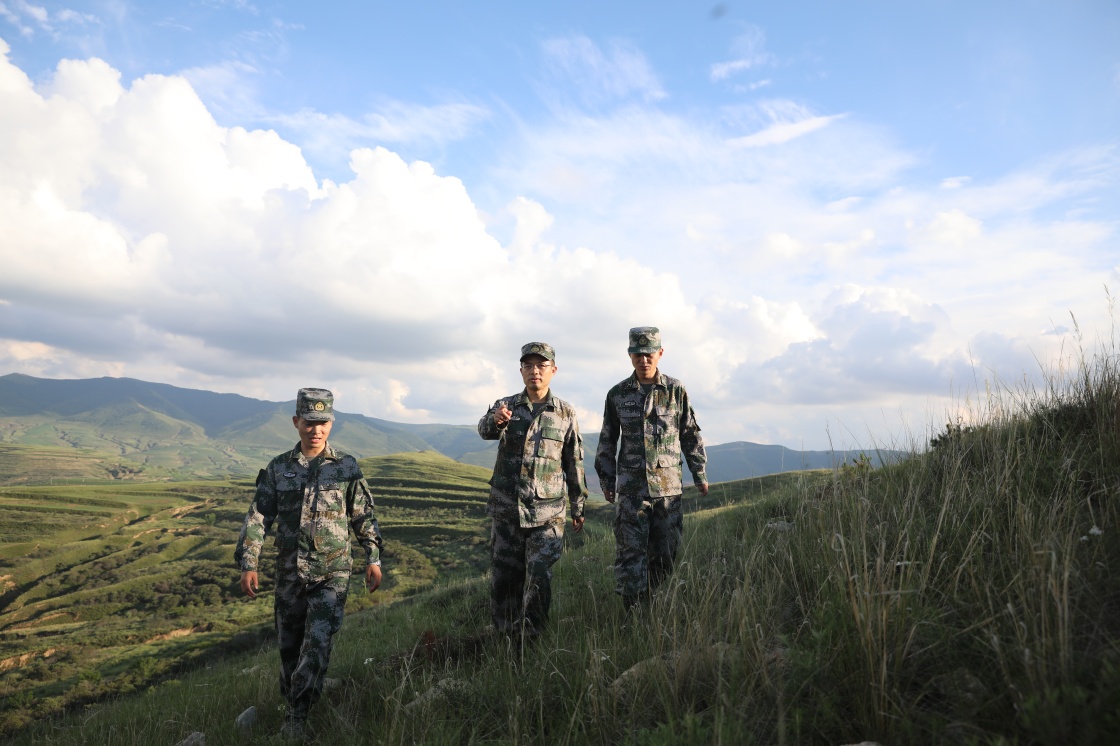 戰(zhàn)略支援部隊某部高級工程師淳靜(中)對訓(xùn)練場籌建情況進行勘察(7月18日攝)。新華社發(fā)