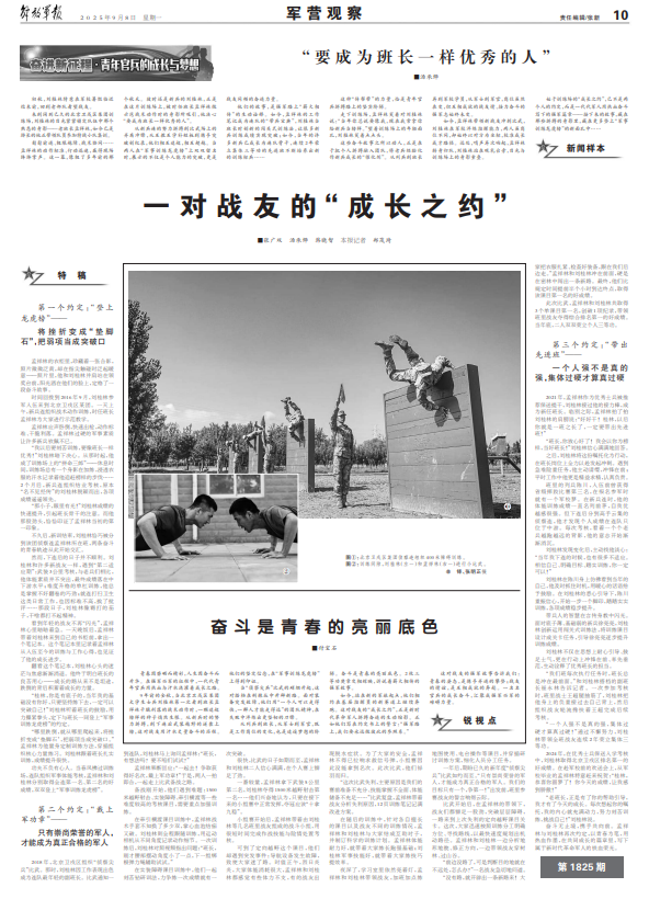 如今,站在新的軍旅起點,他們相約在基層指揮員的新賽道上繼續(xù)奔跑。這對戰(zhàn)友的“成長之約”,正是新時代革命軍人拼搏奮進的生動縮影。正如他們寫在約定書上的誓言:“強軍路上,我們要永遠做彼此的參照系?!?/p>