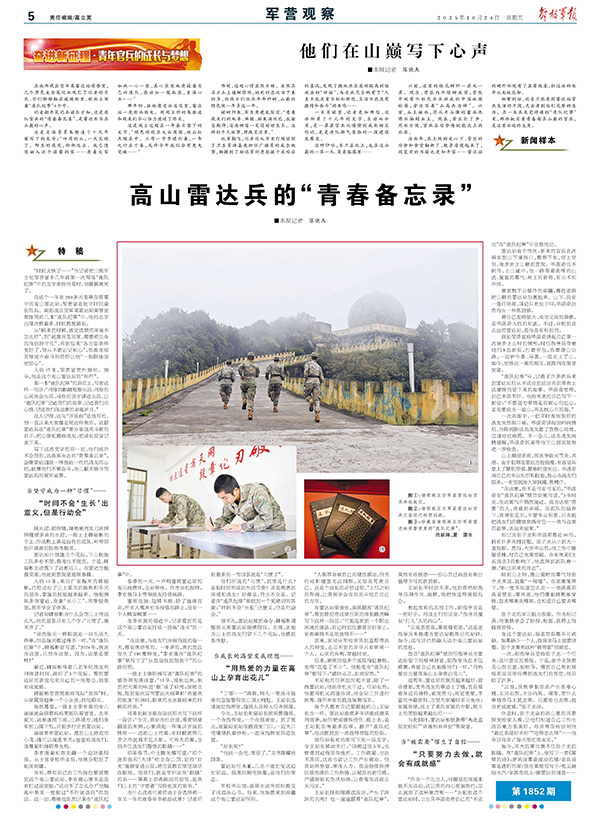 紙頁翻飛,記者還從字里行間讀到了衛(wèi)生員湯嘉庚擔(dān)任廣播員的成長故事,觸摸到了標記員付忠彪提干成功后的喜悅,發(fā)現(xiàn)了操縱班長莫輝提高訓(xùn)練效益的“妙招”,與老兵范吉鵬有了“人生不能沒有目標和理想,生活不能沒有激情和奮斗”的共鳴……