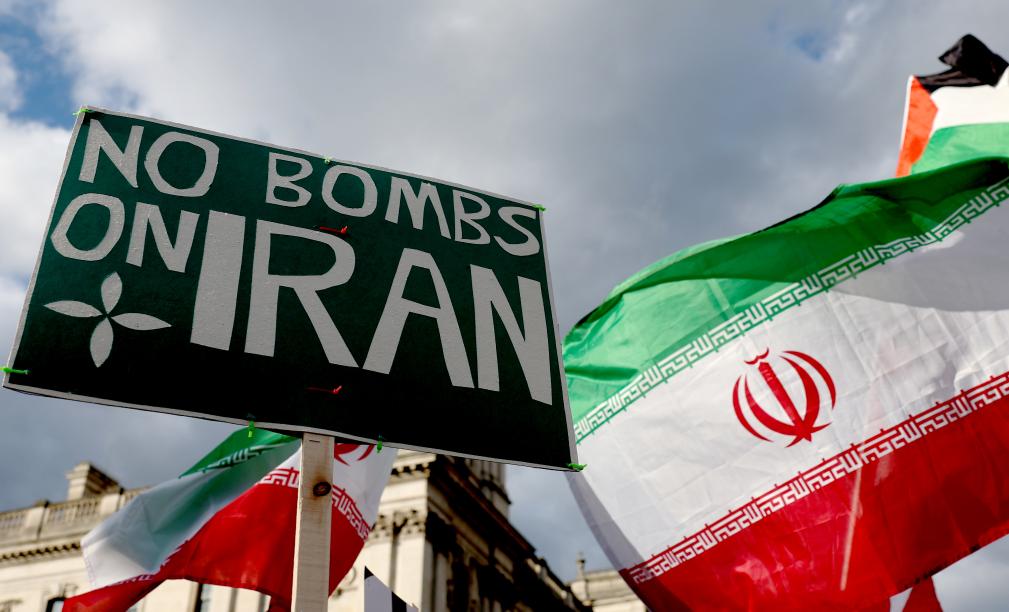 2月28日,民眾在英國倫敦議會廣場舉行示威,抗議美國和以色列軍事打擊伊朗。新華社記者李穎攝