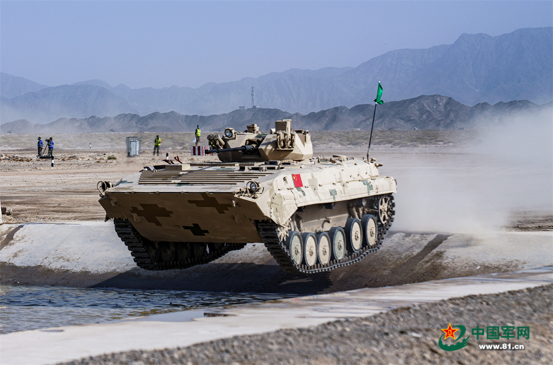 中國參賽隊員駕駛步戰(zhàn)車通過涉水場。李碩勛 攝