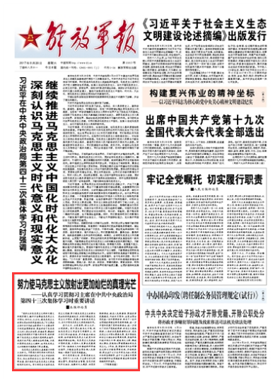 “深刻認(rèn)識(shí)馬克思主義的時(shí)代意義和現(xiàn)實(shí)意義,鍥而不舍推進(jìn)馬克思主義中國化、時(shí)代化、大眾化,使馬克思主義放射出更加燦爛的真理光芒。”習(xí)主席在主持中共中央政治局第四十三次集體學(xué)習(xí)時(shí)發(fā)表重要講話,高度評(píng)價(jià)了馬克思主義對(duì)人類認(rèn)識(shí)世界、改造世界、推動(dòng)社會(huì)進(jìn)步具有的不可替代的作用,深刻闡釋了馬克思主義是我們黨的根本指導(dǎo)、是我們共產(chǎn)黨人理想信念的靈魂,為我們高舉馬克思主義旗幟、運(yùn)用馬克思主義分析解決問題提供了根本遵循。請關(guān)注今日出版的《解放軍報(bào)》評(píng)論員文章: