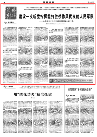 《習(xí)近平談治國(guó)理政》第二卷收入了習(xí)主席關(guān)于國(guó)防和軍隊(duì)建設(shè)的多篇重要論述,充分體現(xiàn)了習(xí)主席領(lǐng)航強(qiáng)軍興軍的理論創(chuàng)造和偉大實(shí)踐,是我們學(xué)習(xí)領(lǐng)悟黨的十九大精神、學(xué)習(xí)理解習(xí)近平強(qiáng)軍思想的權(quán)威教材。建設(shè)一支聽黨指揮、能打勝仗、作風(fēng)優(yōu)良的人民軍隊(duì),是實(shí)現(xiàn)“兩個(gè)一百年”奮斗目標(biāo)、實(shí)現(xiàn)中華民族偉大復(fù)興的戰(zhàn)略支撐,是黨在新時(shí)代的強(qiáng)軍目標(biāo)。請(qǐng)關(guān)注今日《解放軍報(bào)》的報(bào)道——