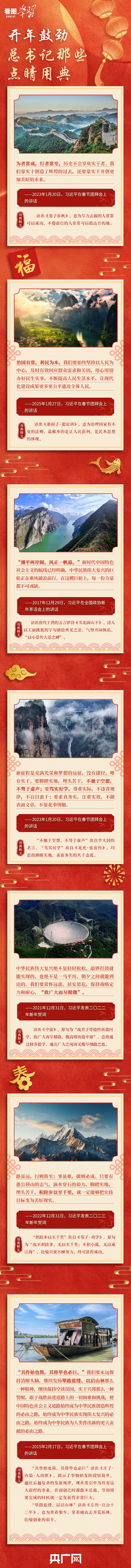 “犯其至難而圖其至遠(yuǎn)”“積跬步以至千里”“為者常成,行者常至,歷史不會(huì)辜負(fù)實(shí)干者”……每逢歲末年初,習(xí)近平總書(shū)記都會(huì)發(fā)表重要講話,為大家送祝福、鼓干勁。在這些重要講話中,總書(shū)記時(shí)常引經(jīng)據(jù)典、援古論今,為中華傳統(tǒng)詩(shī)文典故賦予鮮活的新時(shí)代內(nèi)涵。一年之計(jì)在于春,讓我們一起重溫總書(shū)記那些點(diǎn)睛用典,共同開(kāi)啟新的篇章。