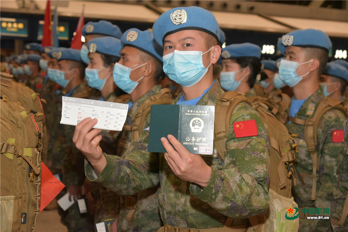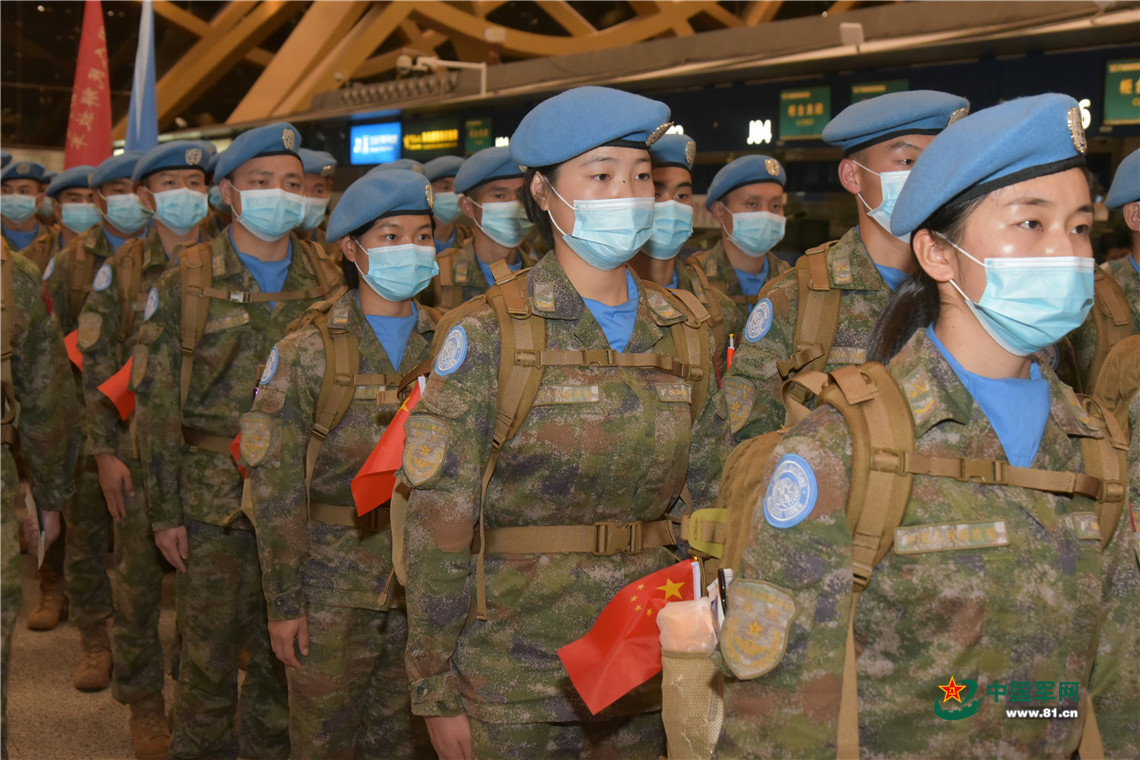 出征的維和官兵們頭戴藍(lán)色貝雷帽、身穿佩戴中國國旗和聯(lián)合國臂章的“星空”迷彩服,以嶄新面貌踏上維和的征程,亮相國際舞臺。